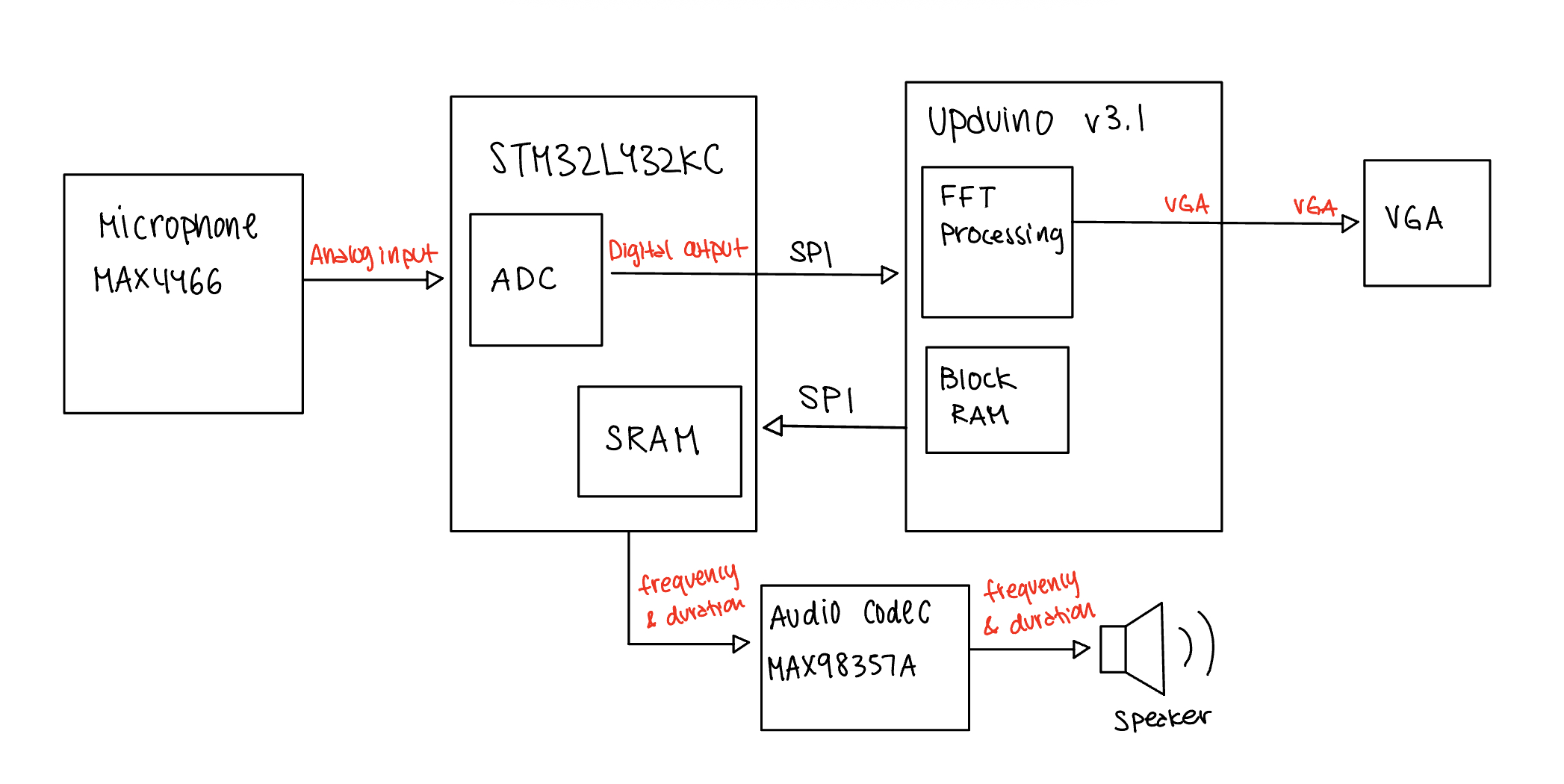 On the hardware level, an analog microphone will take in sounds, where the MCU will convert them into digital signals using ADC and send the converted signals to the FPGA. The MCU will then send the digital signals to the FPGA using SPI. Then, the FPGA will use FFT to extract the frequency and duration of the note inputted. The array of notes will then be used by the FPGA to calculate the pixels for displaying the score on a VGA display. This array of notes, after transcription ends, will be sent to the MCU through SPI to generate the playback audio. The user should be able to control the music transcription and play back audio with a hardware components such as a switch or a button, and control the volume with a potentiometer.