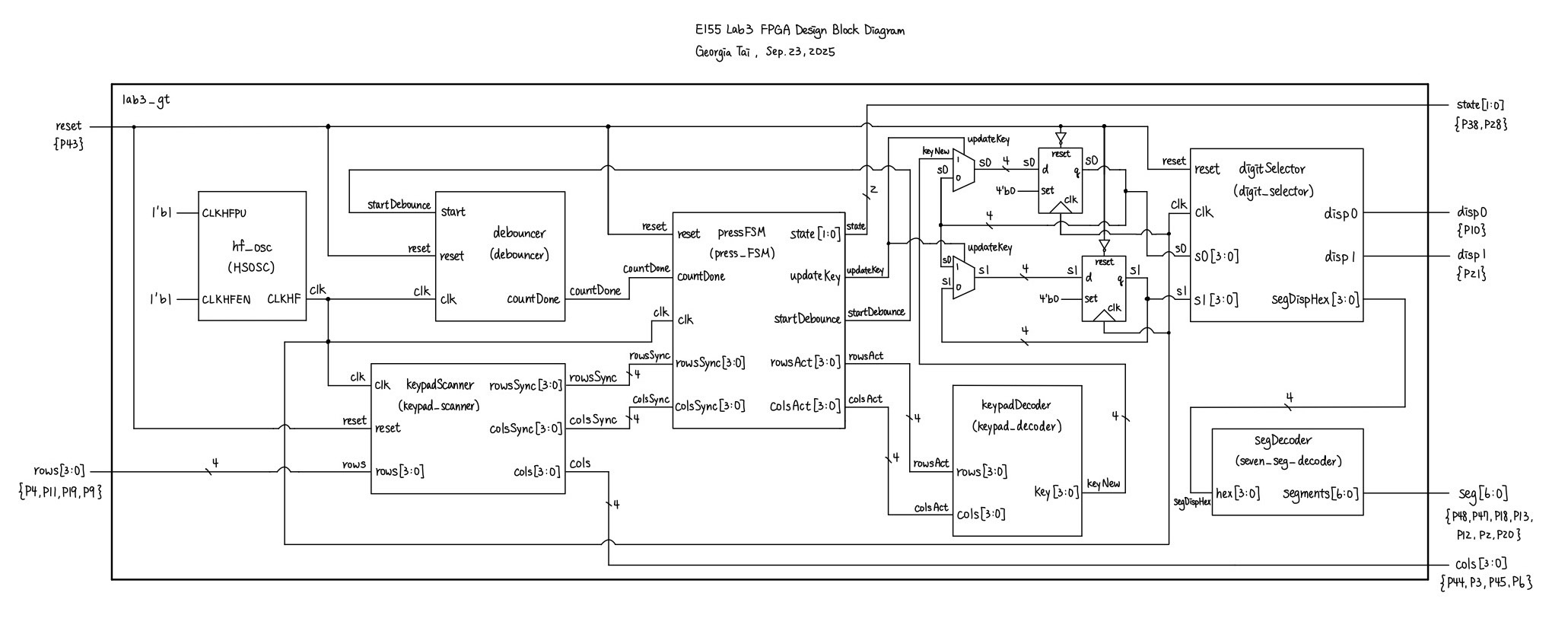The goal of this design is to practice multiplexing by designing a FPGA that can scan a 4-by-4 matrix keypad and display the two most recently-pressed digits on a dual 7-segment display. Only one 7-segment decoder module can be used for both digits on the display, resulting in the need of time-multiplexing, and the user inputs from the keypad may be asynchronous.