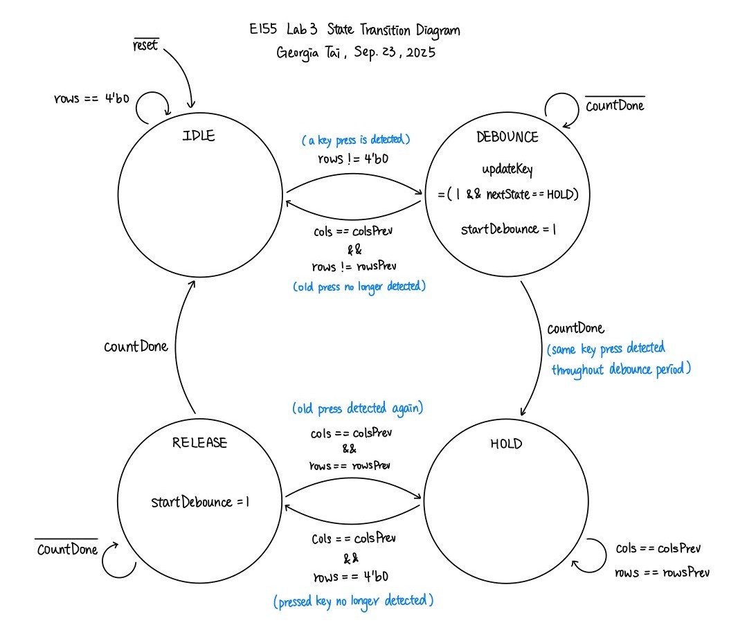 This FSM includes four states: IDLE, DEBOUNCE, HOLD, and RELEASE. The IDLE state works with the keypad_scanner to look for any pressed key. The keypad scanner drives voltage through each column of the keypad repeatedly, from column 0 to column 3, and searches for a pressed key when a corresponding row is high. When a key press is detected, the FSM transition into DEBOUNCE, which sends a startDebounce signal to the debouncer and waits for the countDone signal. The countDone signal indicates that the debounce period (100 ms) has ended, confirming that the key is in fact pressed and allowing the FSM to transition into state HOLD. Note that if the press is no longer detected (active rows changed when the same column is driven), the DEBOUNCE state moves back to the IDLE state. In state HOLD, if the rows input of the column originally pressed changes, then the FSM enters state RELEASE. This state uses a similar method with DEBOUNCE to check whether a key is actually released. The FSM moves on to IDLE if the release is true, and moves back to HOLD if it thinks that the release was simply a debounce.