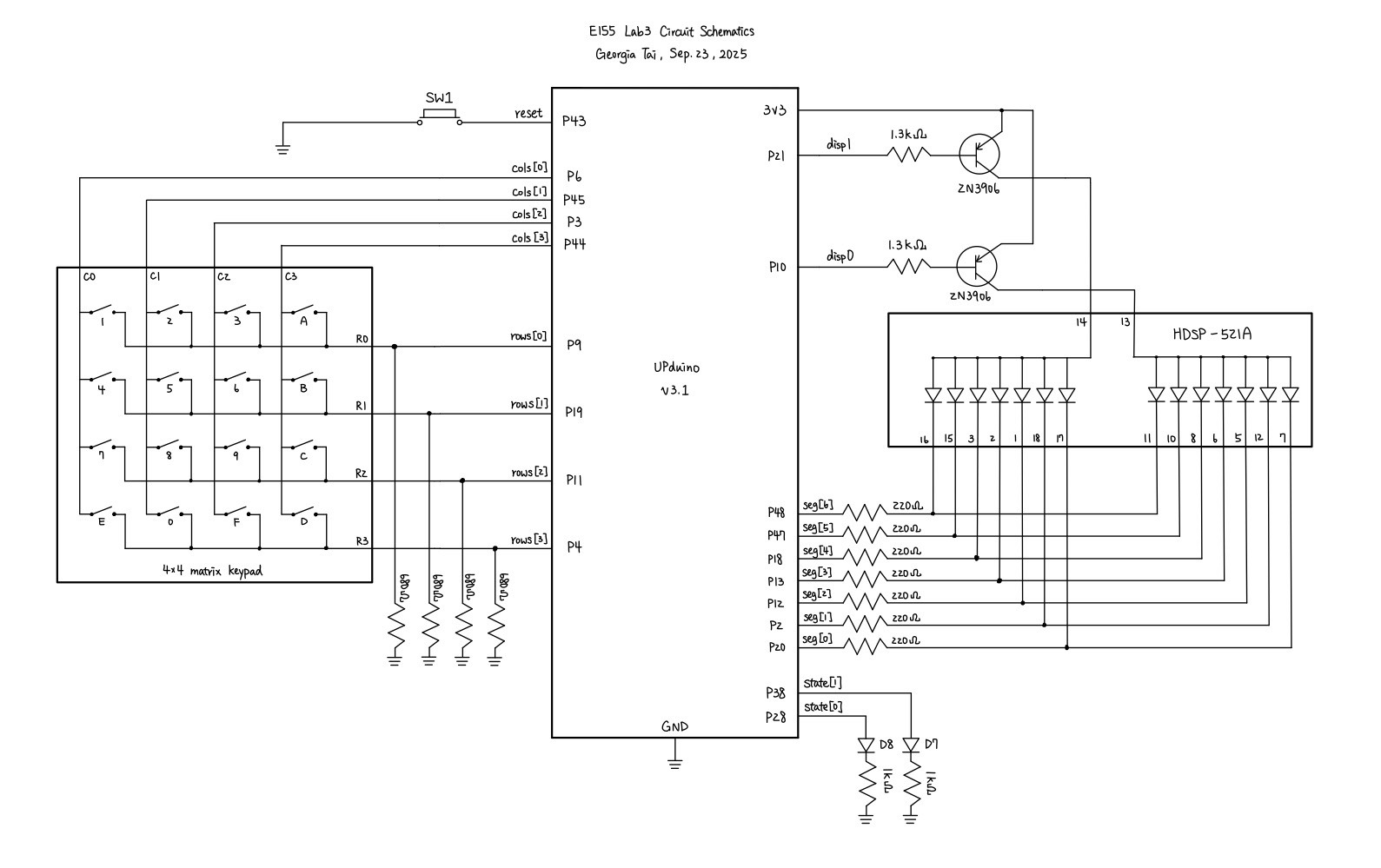In terms of the circuitry design, similar to Lab 2, the dual 7-segment display was externally accessed on a breadboard, with each of its two common anode connected to a 2N3906 PNP transistor to provide enough current. The 4-by-4 keypad matrix was also externally connected, with a pull-down resistor of \(680 \ohm\) connecting the rows to ground. Given the large \(100 k \ohm\) internal pull-up resistors in the PCB provided by the course, this pull-down resistor was chosen to be small enough to prevent the presence of a voltage divider. Two LEDs, D7 and D8, on the PCB are also used to show the states which the FSM is in, mainly for debugging purposes. The schematics for the physical circuit design is shown in the following graph: