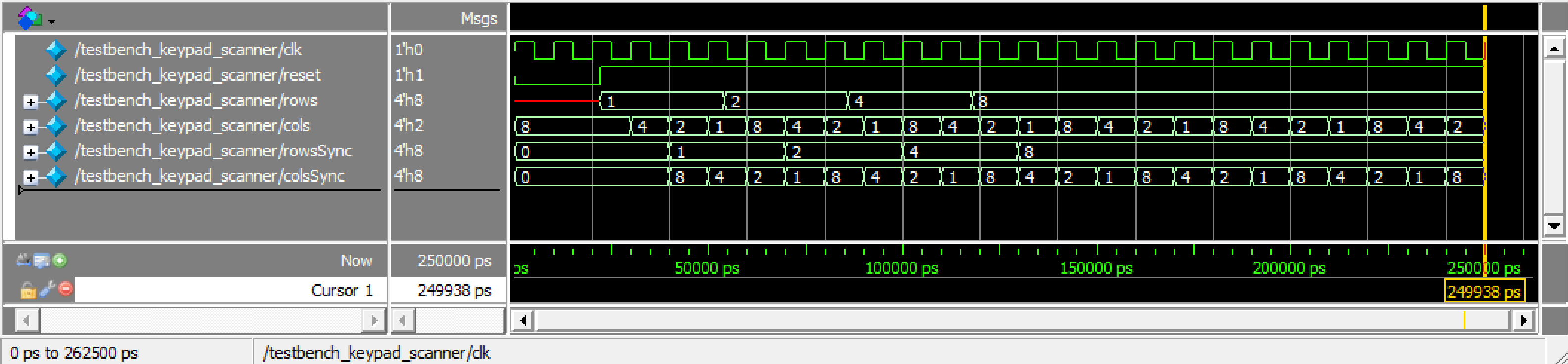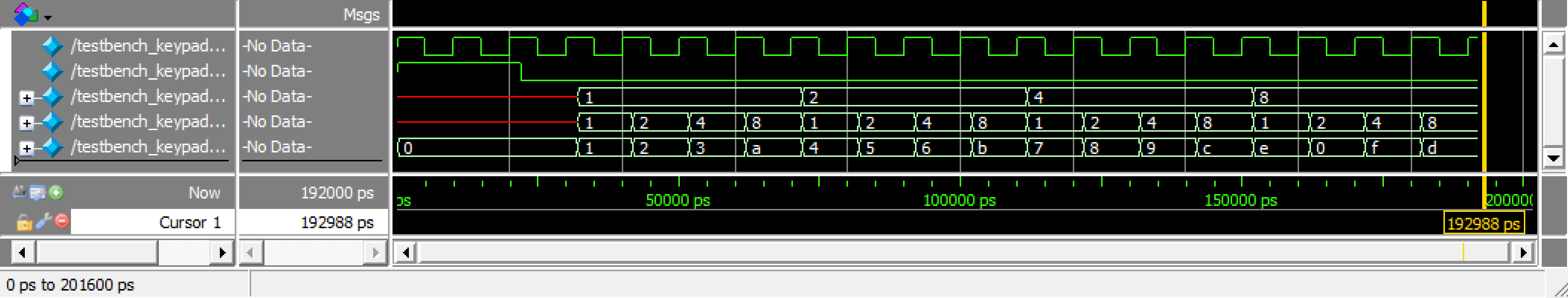 Each of the modules are testes with automated testbenches. The keypad_scanner was tested with inputting different rows and checking in two clock cycles if they are in sync. The keypad_decoder was simply tested with a set of combinational logic, making sure that the correct input of cols and rows outputs the right key in hexadecimal. The FSM module was tested, as the simulation tutorial, with key presses and releases, and ensuring that it passes through each of the 4 states. The debouncer and the digit_selector works very similarly, and only needs to show that the clock toggles.