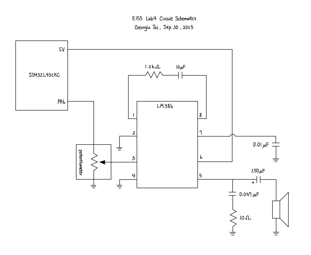 The circuitry design was referenced from the LM386 datasheet, where I chose to use the circuit with a gain of 50. The schematics for the physical circuit design is shown in the following graph: