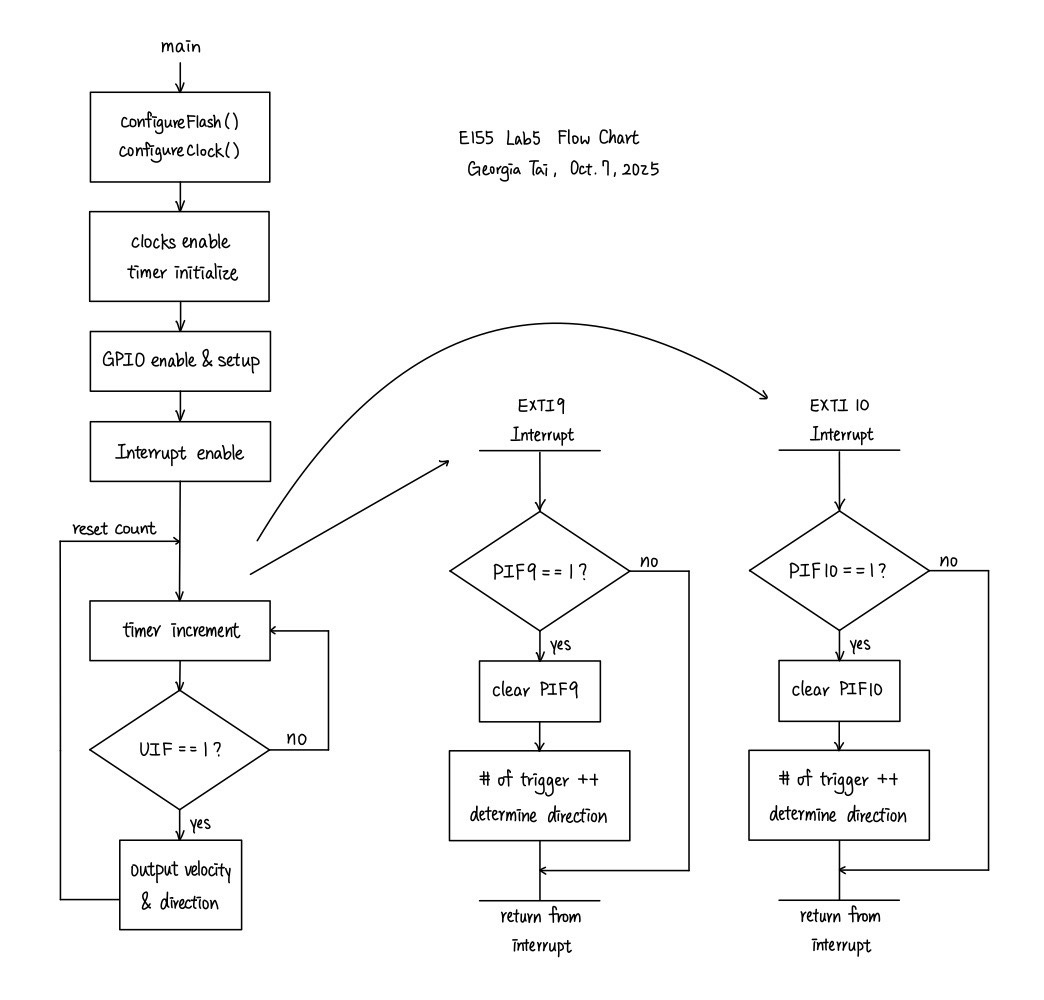 To enable the interrupts and correctly handle them, I wrote the functions EXTI9_5_IRQHandler and EXTI15_10_IRQHandler, respectively for PA9 and PA10. The handlers should update (increase or decrease) the count of triggers and determine the direction of the rotation. From observation, it can be seen that which ever encoder came first for each rotating direction has high on rising edge and low on falling, whereas the other encoder is a low and high, respectively. On the other hand, which ever came the later for each rotating direction had both encoders on high or low when there is an edge. Using such logic, we can find the direction which the motor is spinning by reading the input pins when interrupts happen. The flow chart for the interrupt design is described in the following picture: