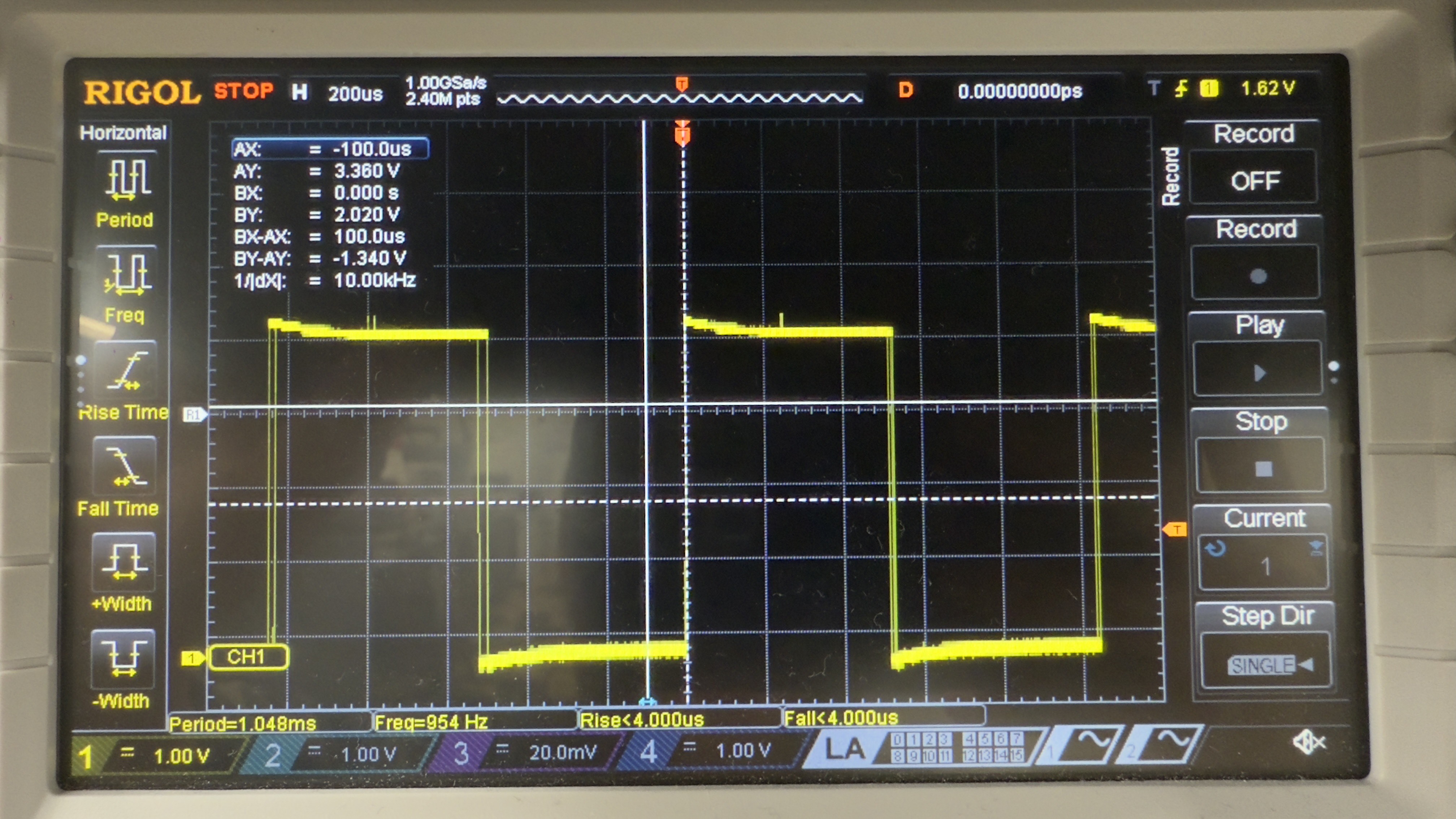 When 10.02V is supplied to the motor, the output of one of its encoder has a frequency of 954 Hz, as shown in the following oscilloscope trace: