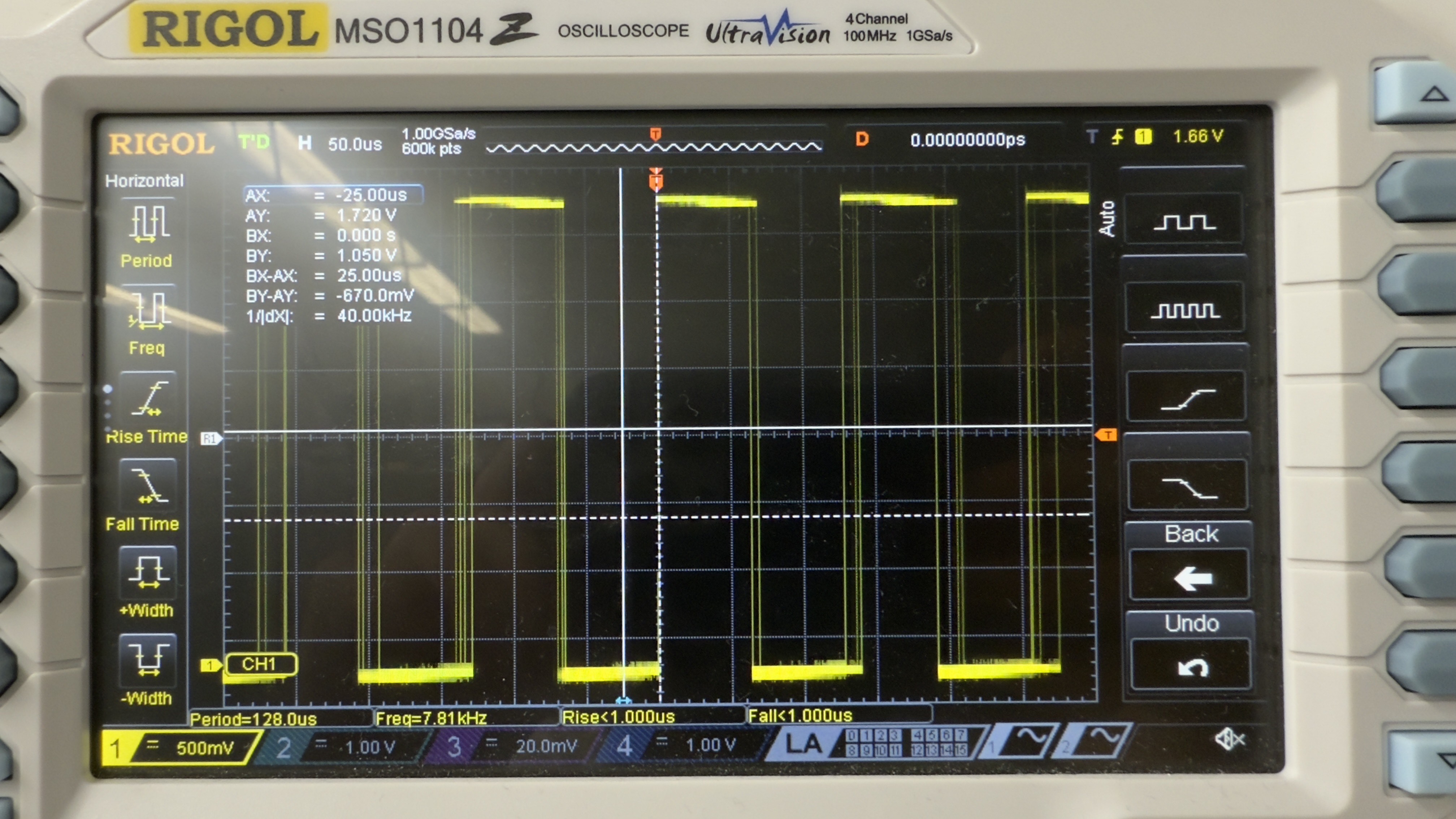 The toggled pin had a frequency of 7.81 kHz. The maximum motor speed which it should be able to detect is thus: \[ \omega_{max, pol} = \frac{7.81 * 10^3 \ Hz}{408 \ rev^{-1}} \approx 19.14 \ rev/s \]