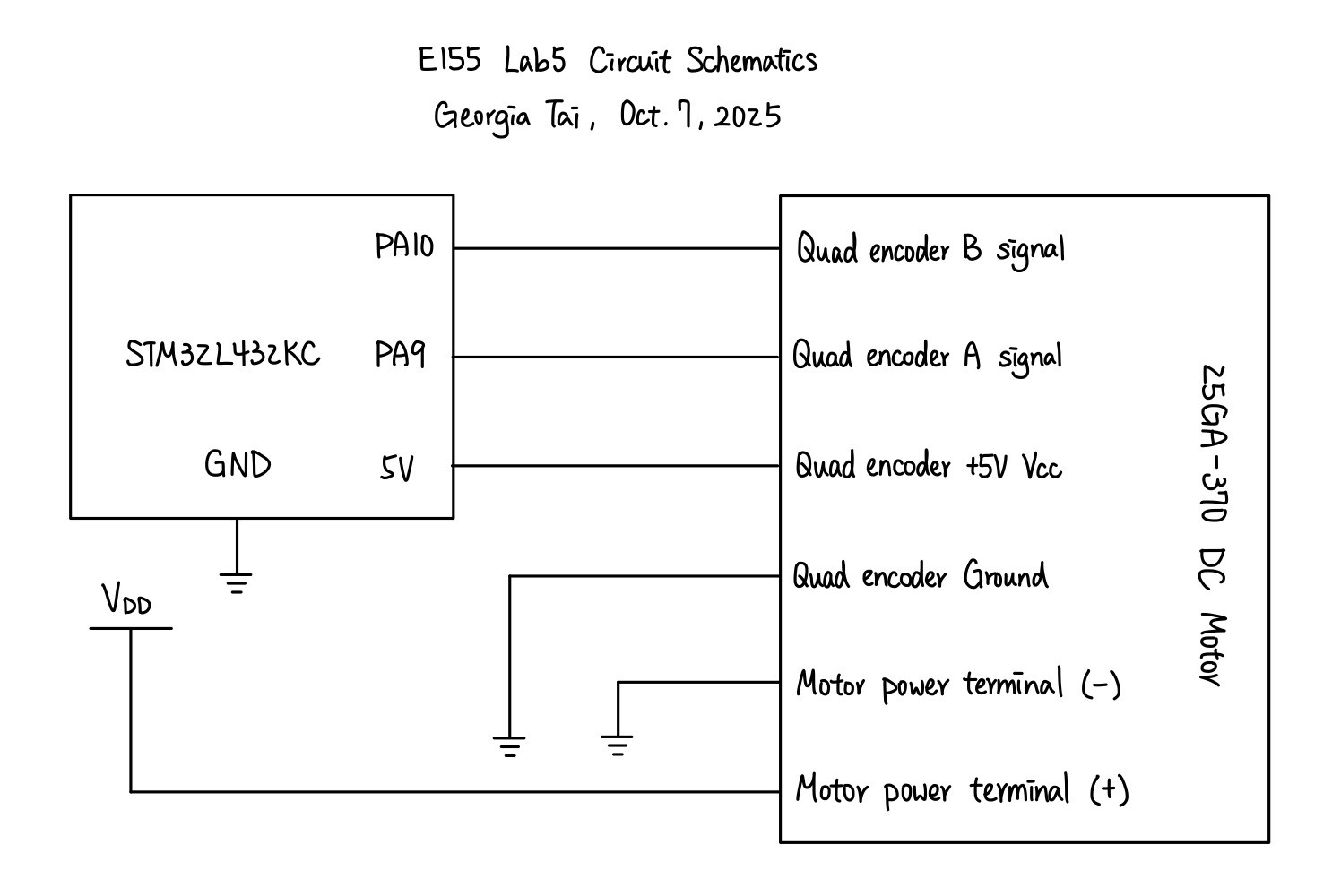 I used libraries provided by the course for setting up most of the MCU. However, I reused the timer functions which I created in lab 4, since I was more familiar with its prescalar calculations. Referencing the STM32L432KC reference manual, programming manual, and datasheet, I was able to utilize functions to set up and enable the interrupts. Specifically, PA9 for encoder A and PA10 for encoder B was chosen as they were 5V compatible.